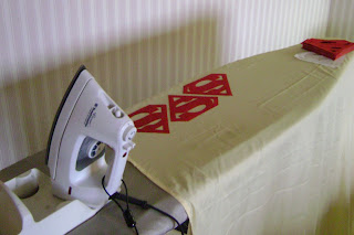 On top of our own costumes, I was making S shield patches to give out to anyone who may have forgotten their superhero outfits at home. Unfortunately, I didn't buy the iron-on interfacing for the patches (and read the instructions) until I had already traced and cut out a couple dozen red logos. Only afterwards did I realize that it would be much easier to iron the interfacing to the red fabric before cutting it all out.