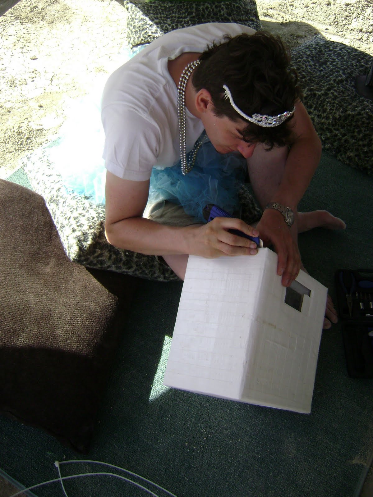 By the time we were ready to leave BC, the diorama was mostly done, but I was still working on wrapping it in white duct tape when we pulled into Vancouver, Washington, to hand our box over to the tiny artist who generously offered to deliver it to the playa for us.