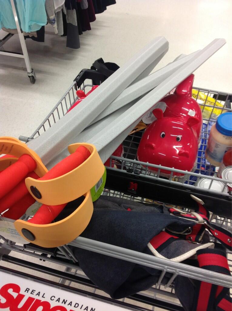 Unfortunately that means I don't have any pictures of the crafts we were working on. Instead, here's a photo of our shopping cart a few weeks ago, filled with some of my favourite wedding-related purchases to date: foam swords and hippo bubble machines.